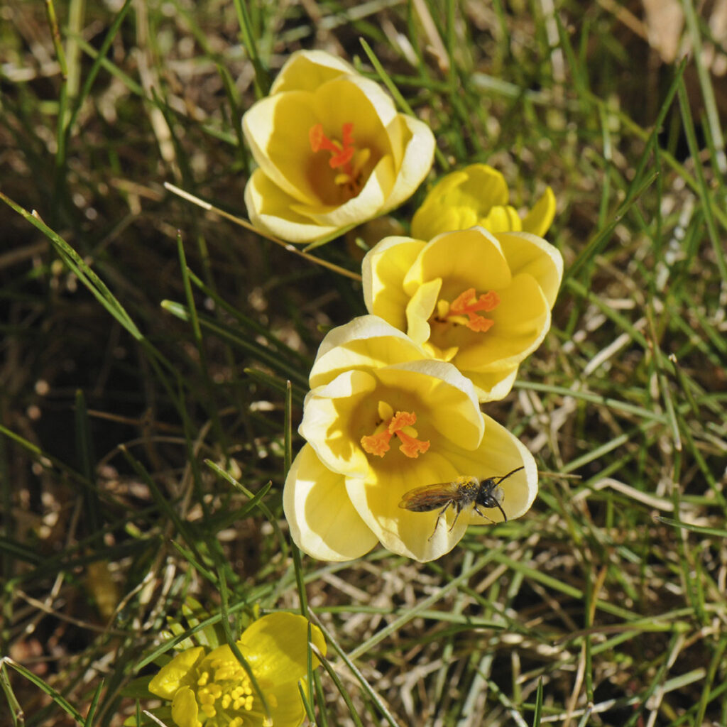 Kaikki sahramit ovat loistavia hyönteiskasveja. Runsas mesi- ja siitepölytarjonta houkuttelee monenlaisia pölyttäjiä kukille, kuvassa on pieni villimehiläinen. Talvilevolta herännyt kimalaiskuningatar saattaa viettää yön krookuksenkukassa ennen kuin löytää pesäkolon, jonne munia uuden sukupolven.