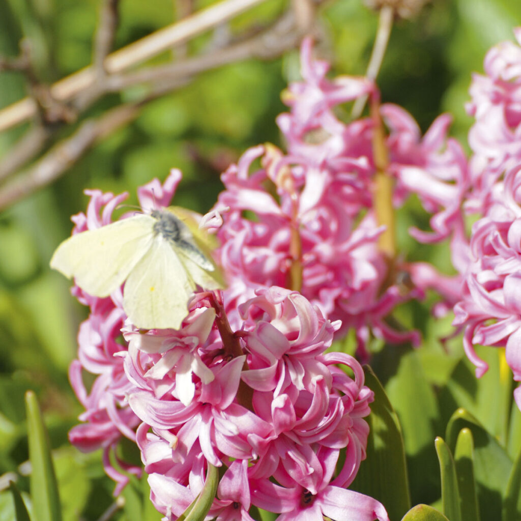 Vaikka tuoksuhyasintti on melkoisen jalostettu kukka, ovat sillä tallella hyönteisiä houkuttelevat ominaisuudet: tuoksu ja monikukkainen varsi. Kaikki hyönteiset eivät reagoi tuoksuun, mutta perhosia se houkuttelee. Sitruunaperhonen käy nauttimassa mesiaterian ja pölyttää samalla kukat.