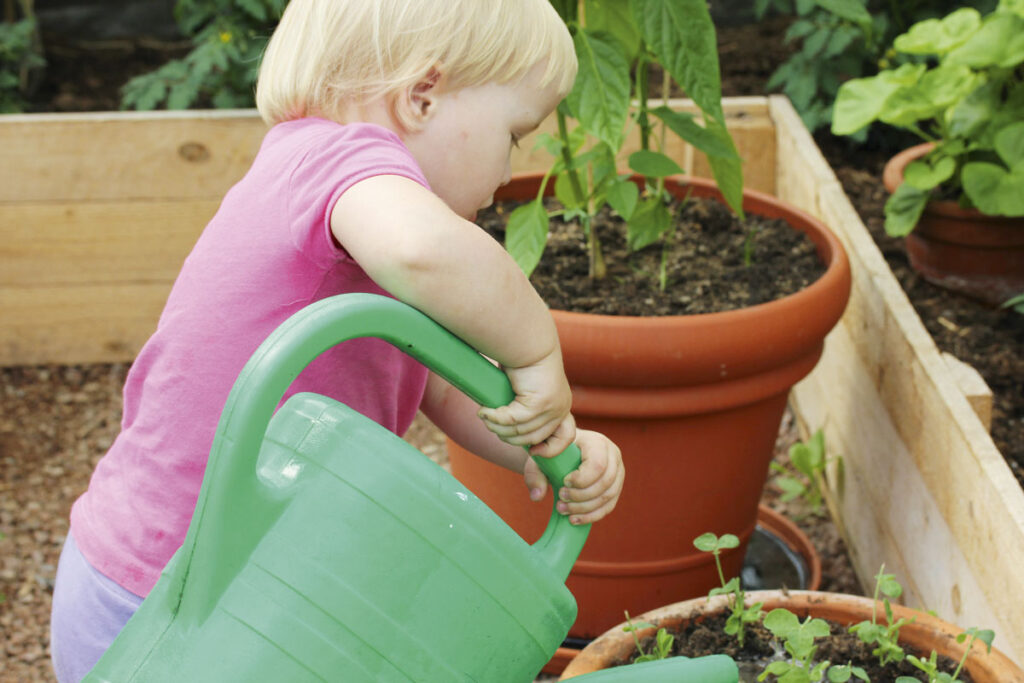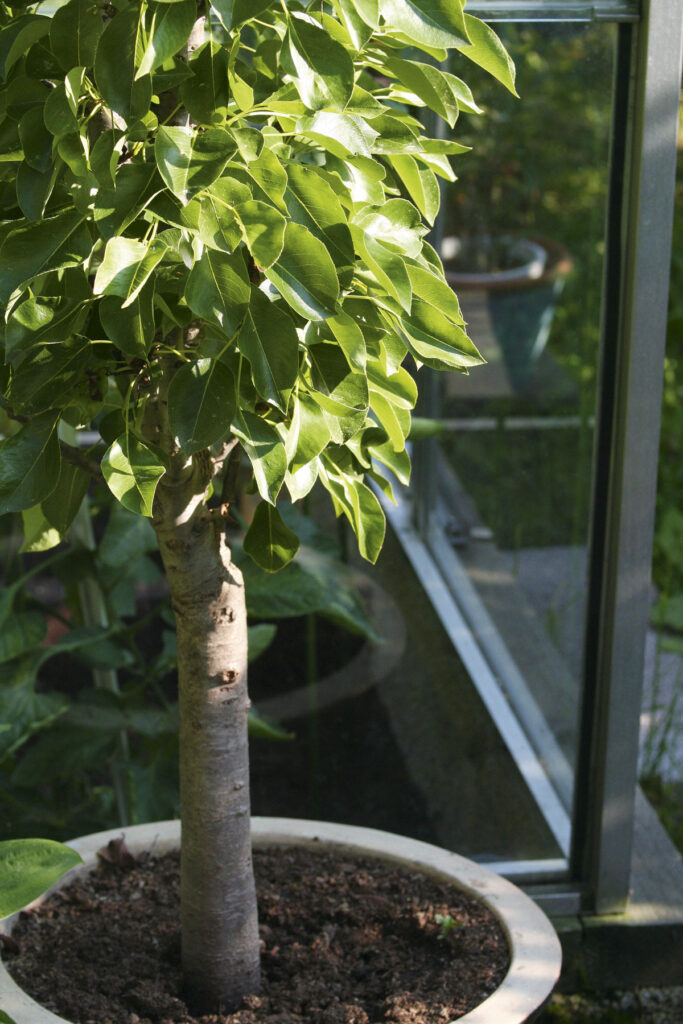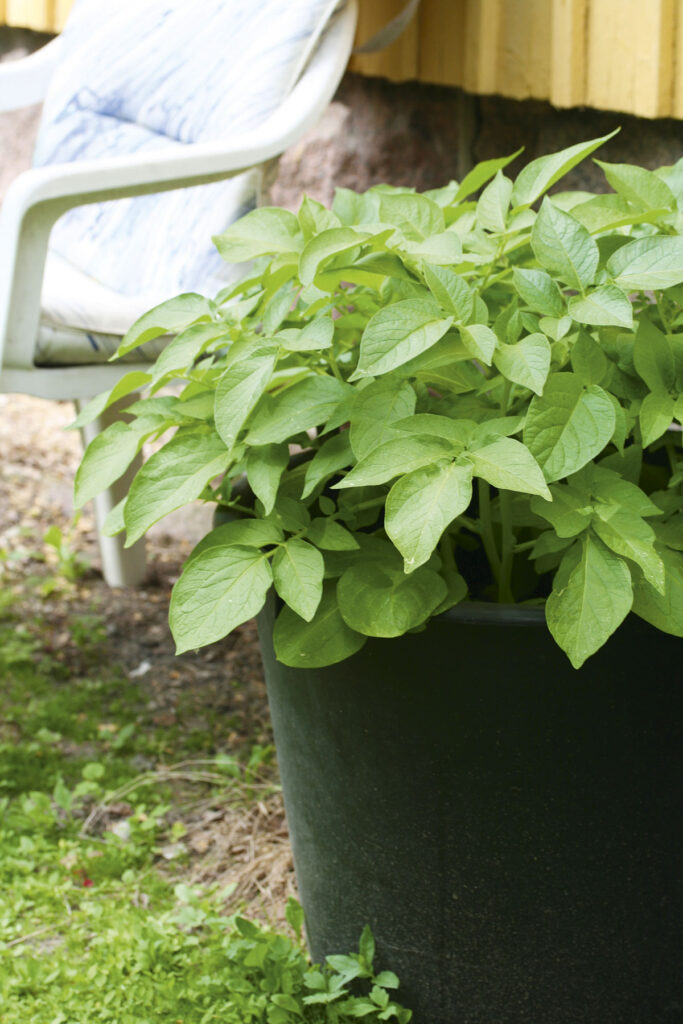 6. Pilarimainen päärynäpuu (Pyrus communis) kasvaa omassa ruukussa. Ruukkupuuna voi kokeilla myös persikkaa, kunhan puulle järjestyy talvisäilö kellarista tai autotallista. 7. Juhannuksen perunat mahtuvat varttumaan pienessä saavissa.