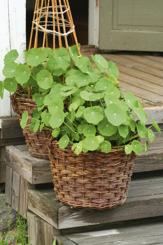 19. Erilaisista ruukuista saa koottua kauniita ryhmiä aina tarpeen mukaan. Kun tarve muuttuu tai loma alkaa, voi kukkiva tarhakin matkata uuteen paikkaan. 20. Mutkattomat krassiruukut (Tropaeolum majus) kylvetään kasvamaan toukokuussa.