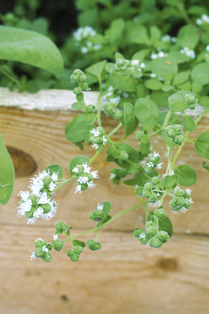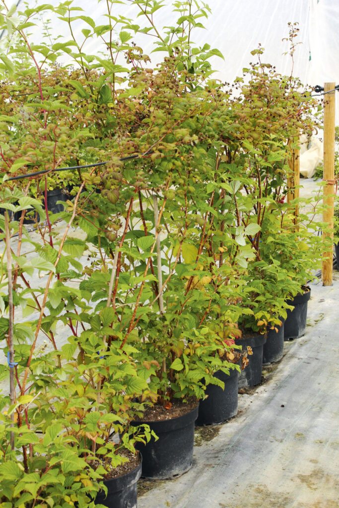 8. Erilainen vadelmapenkki kasvaa muovihuoneessa. 9. Monet yrtit, kuten maustemeirami (Origanum majorana), kasvavat ruukuissa kauneimmiksi. Kokeile myös laventelia (Lavandula angustifolia) tai avomaalla hitaasti versovaa persiljaa (Petroselinum crispum). 10. Ruukut antavat kasvihuoneeseen lisää kasvuneliöitä. 11. Pelargoneista syntyy kesän kotoisin tunnelma.