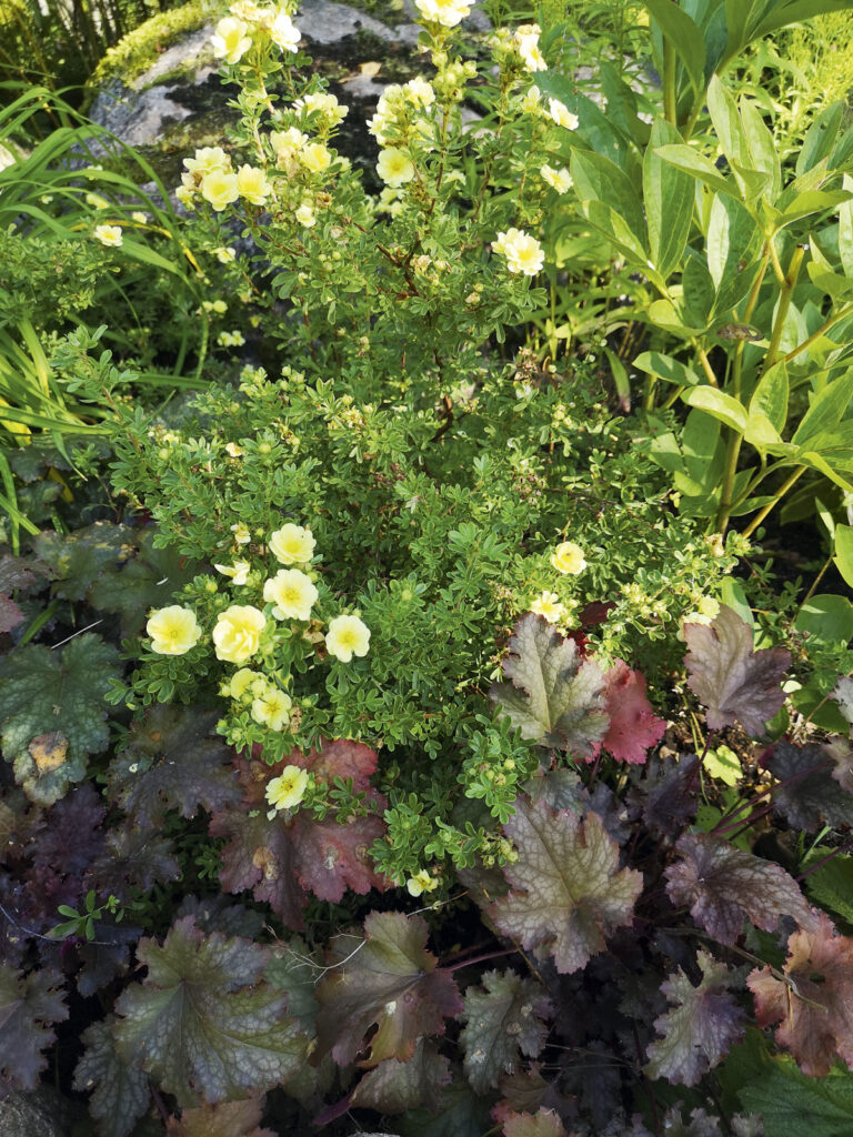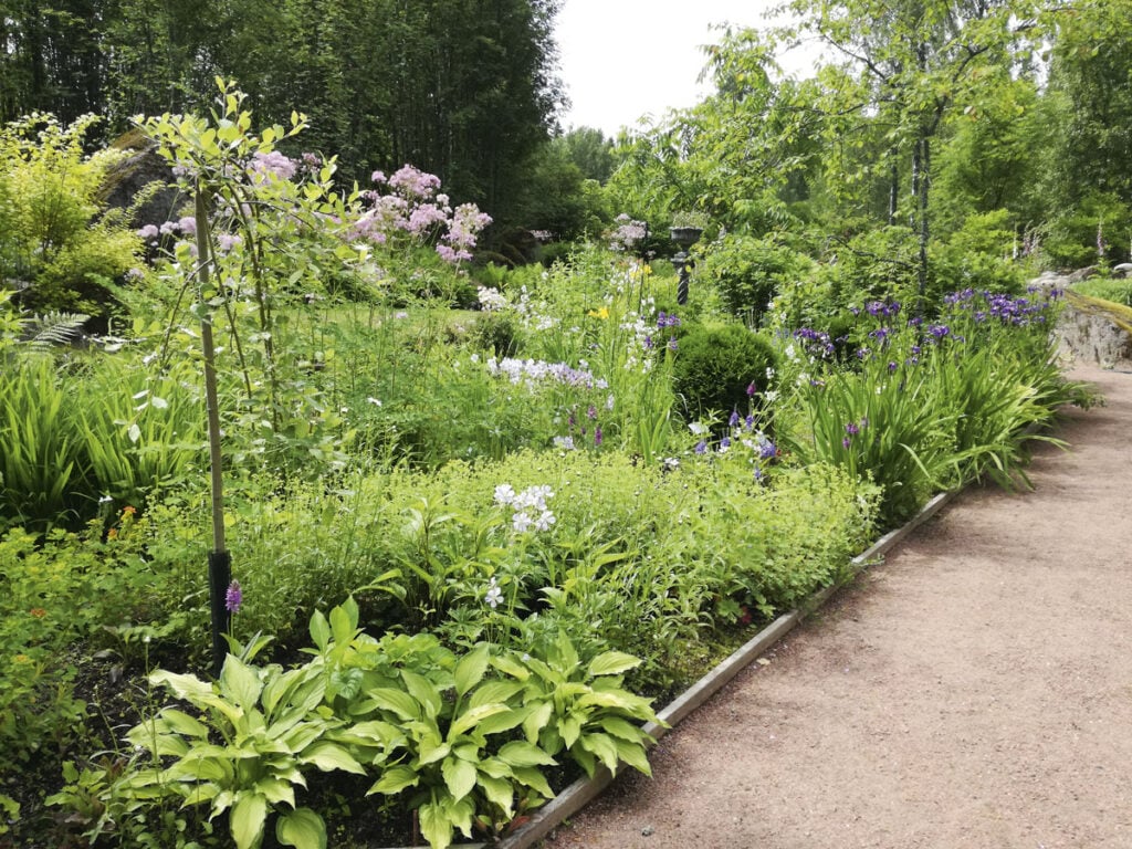 Suurten puiden suoma katve luo otolliset olot lehteville varjopaikan perennoille ja happaman maan alppiruusuille. Vaaleat kukat ja lehdet ovat varjopuutarhan valopilkkuja.
