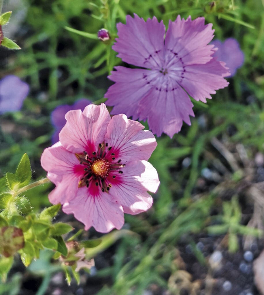 Nepalinhanhikki (Potentilla nepalensis) ja amurinneilikka (Dianthus amurensis) ovat suloisia yhdessä.