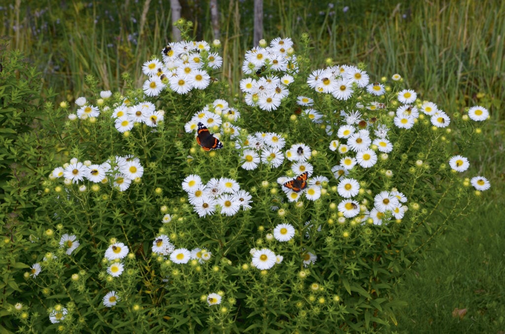 "Japaninasteri" (A. glehnii 'Agleni') valkoinen, paljon pieniä mykeröitä, elo–lokakuu, 1–2 m.