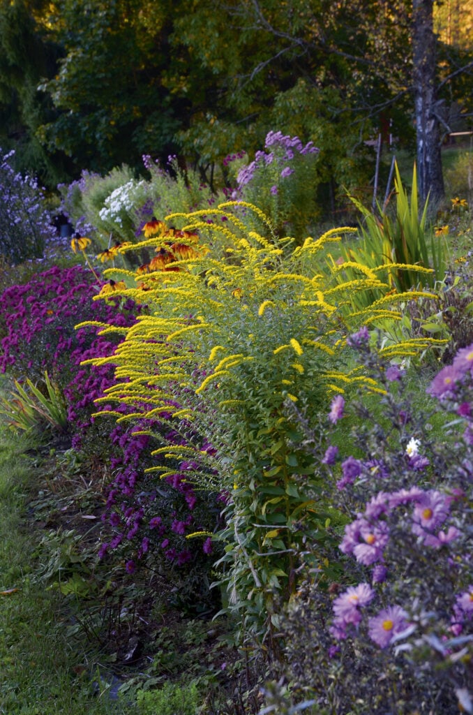(Solidago rugosa) lajikenimi on osuvasti 'Fireworks', Ilotulitus. Punakukkaiset, matalahkot syysasteripehkot ovat 'Royal Ruby' -lajiketta. Taustalla tuoksuastereita. Kuva on otettu 16.10.2020, kasvuvyöhyke 1b.