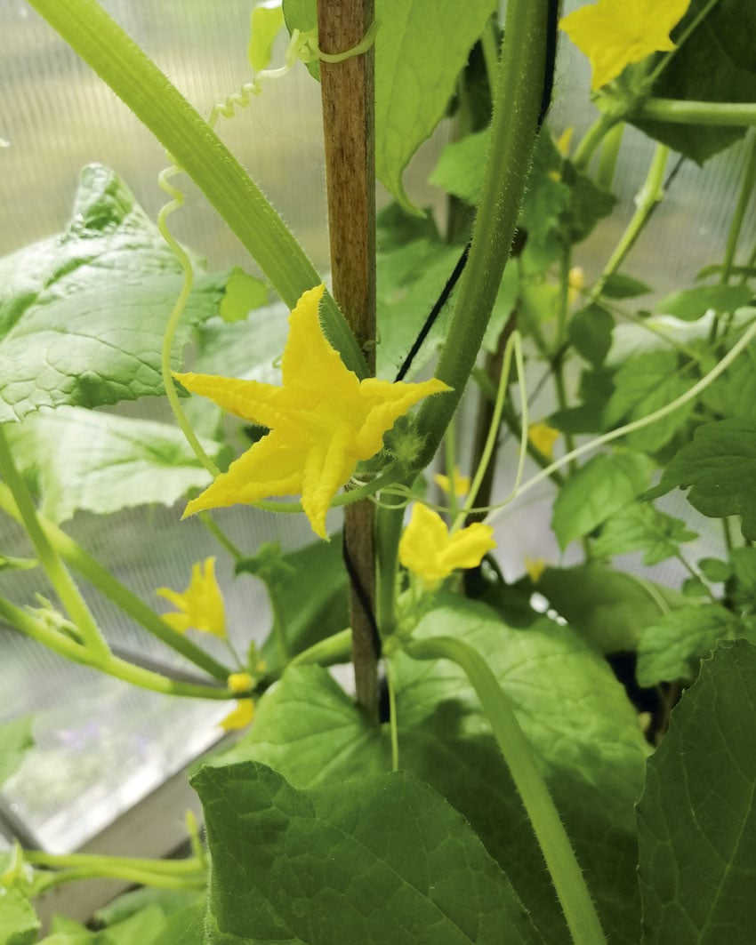 Kasvihuonekurkku kukkii. Kurkku tuottaa mukavasti satoa heinäkuusta lähtien, ja taimet on helppo kasvattaa itse siemenestä. Kasvihuonekurkut ovat yleensä itsepölytteisiä ja karvasaineettomia.