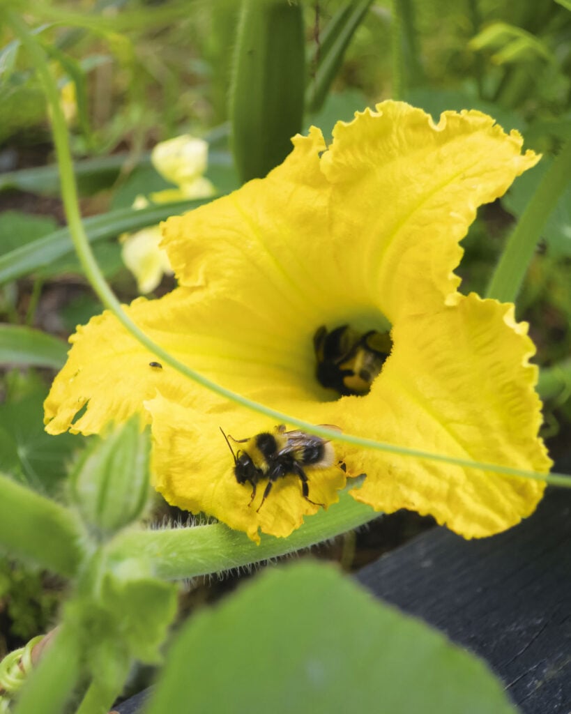 Komeasti kasvuun lähteneet sipulit mätänevät kaatosateessa loppukesällä eli silloin, kun niiden tulisi olla pulleina kuivumassa elokuun helteessä. Hyvänä kesänä kesäkurpitsasato täyttää niin kodin jääkaapin kuin keittiön työtasonkin. Siitä viisastuneena kasvatan seuraavana keväänä ainoastaan muutaman taimen vain huomatakseni, että joku tuholainen söi ne jo sirkkalehtivaiheessa. Toukokuun lopulla kylvän paniikissa uuden satsin siemeniä, koska ainahan kesäkurpitsaa pitää olla. Kaikkien kurpitsojen kukinta jäi viime kesänä myöhäiseksi, mutta sain lohtua nähdessäni, kuinka kimalaiset käpertyivät nukkumaan suuriin kurpitsankukkiin.