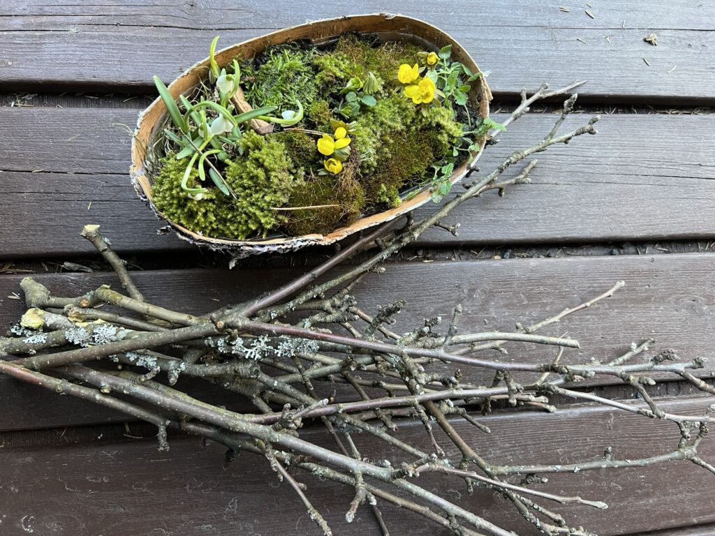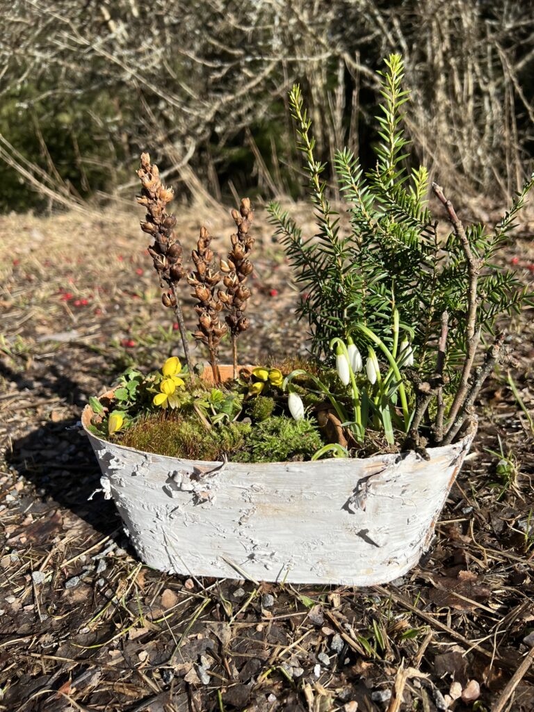En liten vårplantering i en återanvänd korg från julplanteringarna blir en fin present. Gräv tillräckligt djupt för snödroppens lök och vintergäckens knöl är längre ner i jorden än vad man tror och jorden kan ännu vara hård av tjäle trots utslagna blommor.