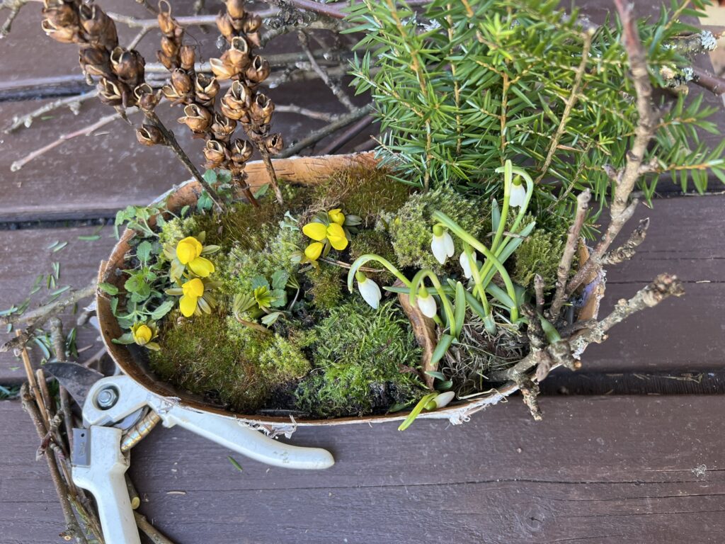 Snödroppar, vintergäck, mossa och en krypande vild veronica tillsammans med äppel- och hemlockskvistar samt fröställningar från sköldpaddsört i en sparad julkorg. Kan det bli bättre?