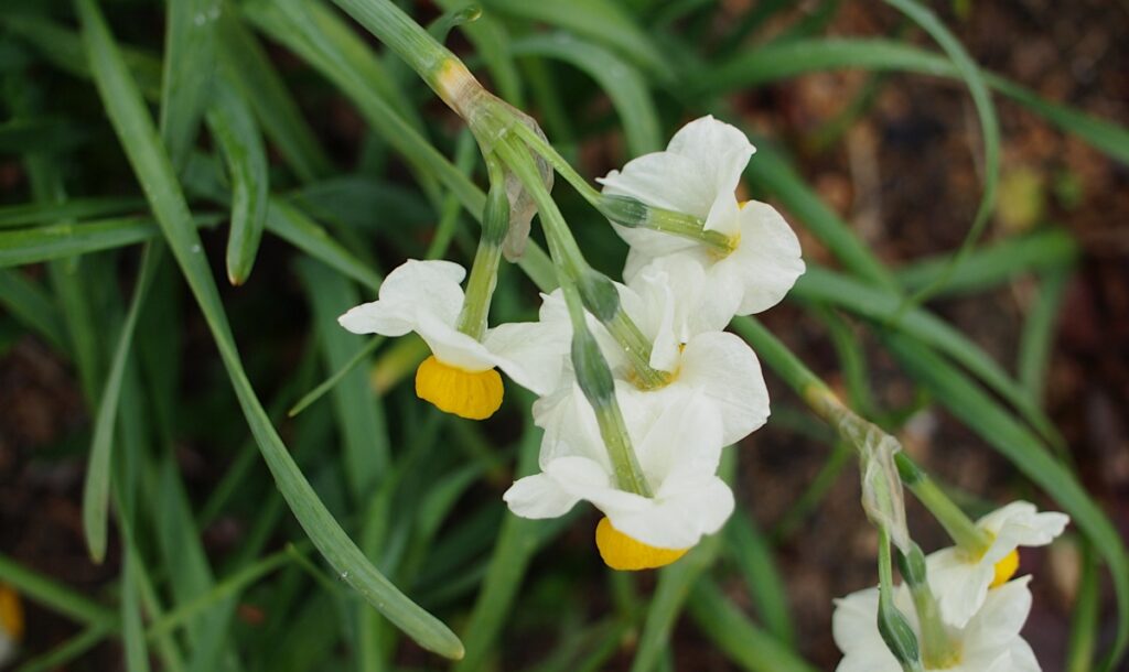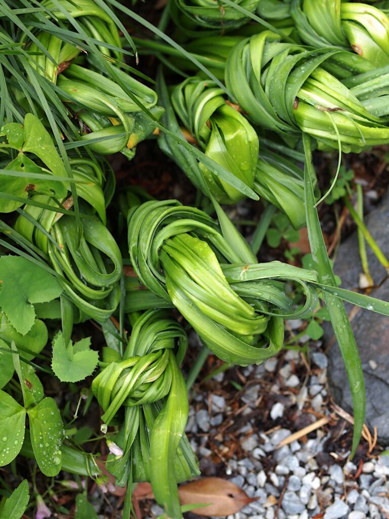 Japanilaisten tasettinarsissin lehdet ovat pitkät, ja kun ne alkavat myöhemmin keväällä lakoontua, ne voi kietaista solmuksi. Kun solmukin alkaa painua maata kohden, ne irtoavat sipulista kevyellä vetäisyllä.
