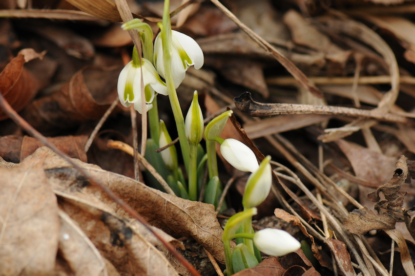 Viime yönä ei ollut enää pakkasta. ’Hippolyta’ poikineen nousee maasta, tämä on toinen rypäs edellisten kuvien varhaisen tiedustelijan lähellä. Moni muukin lumikello on jo noussut ja nupulla, nämä vain kasvavat niin aurinkoisella ja lämpimällä paikalla talon eteläpuolella, että avautuivat ensimmäisinä.