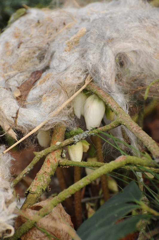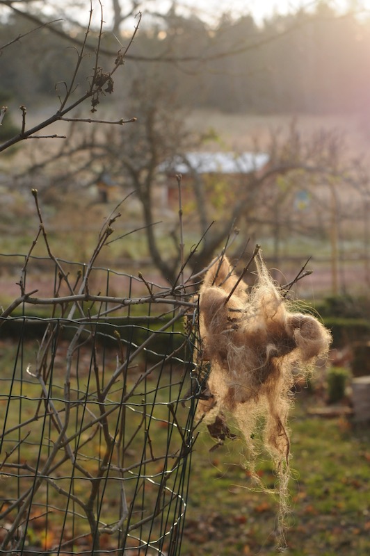 Linnuillekin on villasta iloa, sillä ne pääsevät vuoraamaan sillä talvipesiään. Näiden villojen päälle täytyy vielä viritellä verkkoa, jos tulee kovia tuulia. Ongelmana on vain se, ettei jäätyneeseen maahan saa enää pystytettyä keppejä verkkojen kiinnittämiseen!