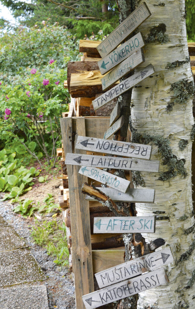 Silta on tarpeen, sillä toisinaan kiviuomassa voi olla kolmekymmentä senttiä vettä.Kyltti opastaa oikeaan suuntaan tai ainakin hymyilyttää. Koristeet tuovat väriä lehtevään puutarhaan.