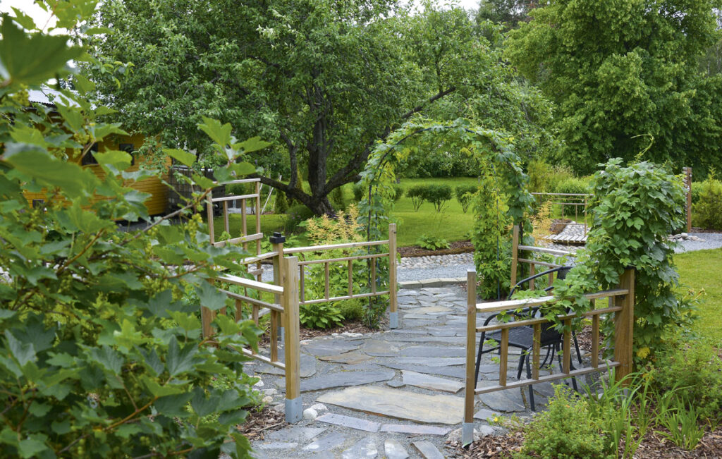Muhosjoen rannalle syntyi kukkea pihapiiri rakkauden siivittämänä. Omin käsin tekeminen, tontin mahdollisuuksien hyödyntäminen ja kierrätysmateriaalien käyttö ovat minibudjetilla toteutetun pihan kulmakivet.