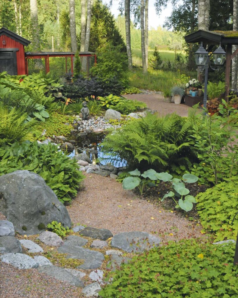 Mänttä-Vilppulassa sijaitseva järvenrantapiha on valtavan monipuolinen. Näkymä on säilynyt levollisena kookkaiden kasviryhmien ja oivaltavasti piilotettujen tilojen ansiosta.