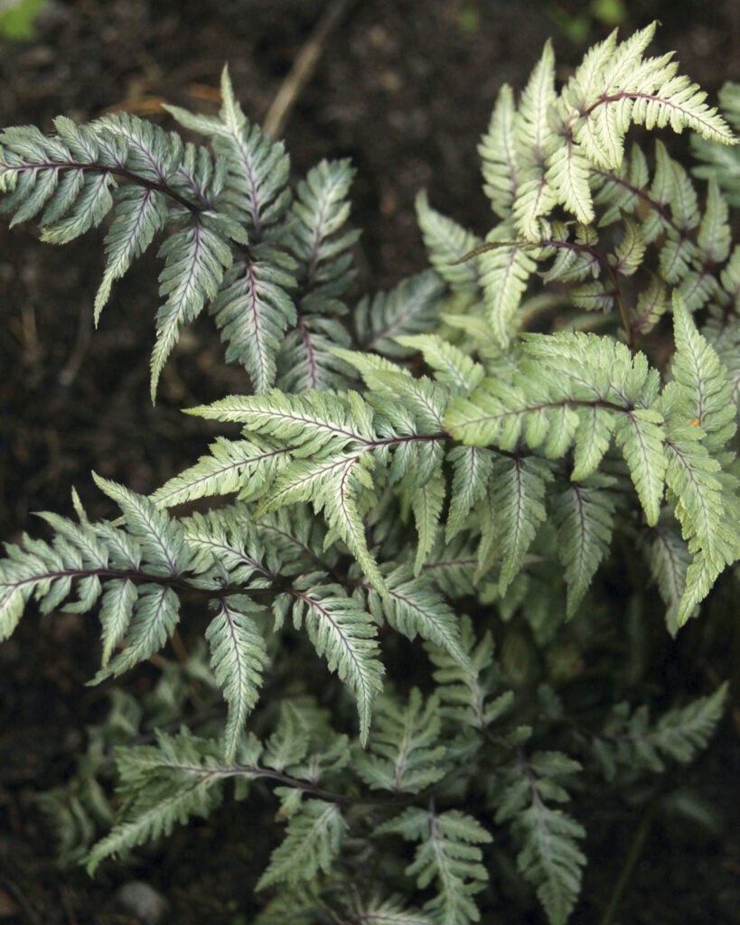 Japaninhiirenporras ’Ursula’s Red’ (Athyrium niponicum) on huomiota herättävä saniainen metsäpuutarhaan.