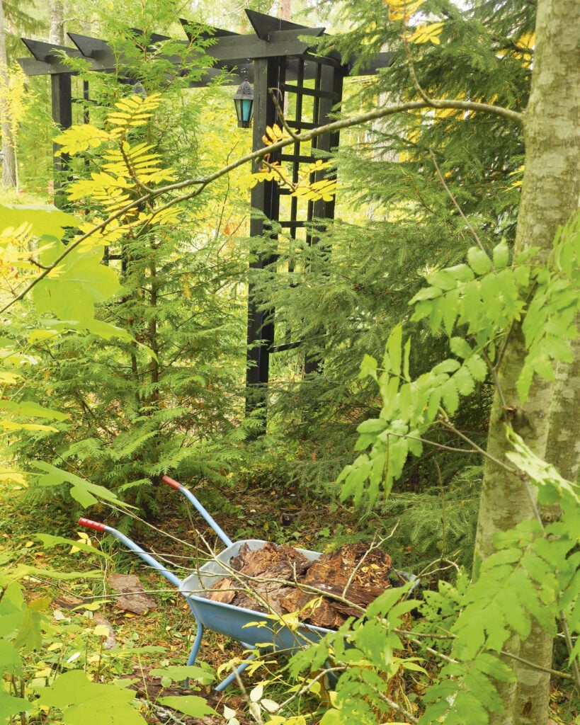 Käytä puiden rankoja ja runkoja rouheana rakennusmateriaalina köynnöstuiksi, pergolaporteiksi ja aidoiksi. Toisaalta siisti, uudesta materiaalista rakennettu portti tai pergola luo huoliteltua ilmettä puolivilliin metsäpuutarhaan.