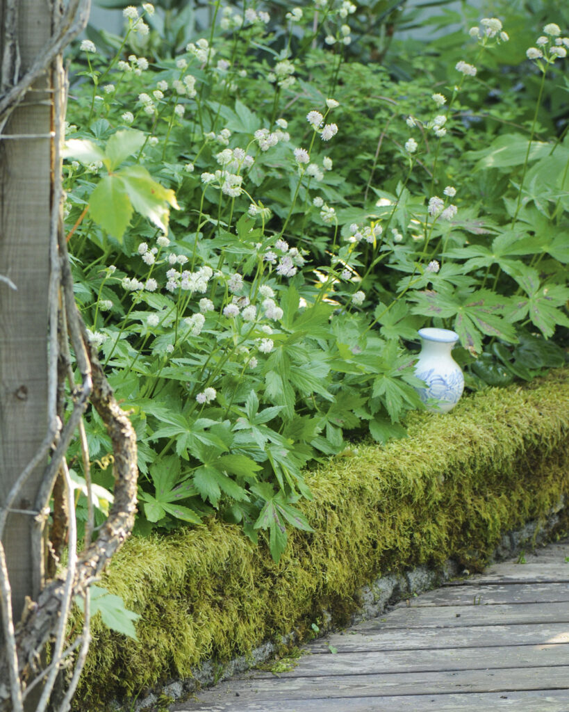 Tavallisen tylsät betoniset muurikivet ovat sammaloituneet kauniiksi ja erottavat terassin varjopenkistä, jossa kukkivat tähtiputket.