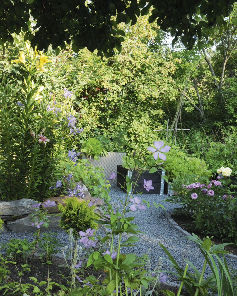 Ruohonleikkuu istutusalueiden välissä oli hankalaa, niinpä väleihin tuli sorakäytävät. Nurmikonleikkuu vie enää vartin. Puulilja on muita päätä pidempi. Sen vierellä kukkii 'Arabella' -tarhakellokärhö (Clematis Integrifolia-Ryhmä). Kuvan keskellä on komea puska idänkermesmarjaa (Phytolacca acinosa).
