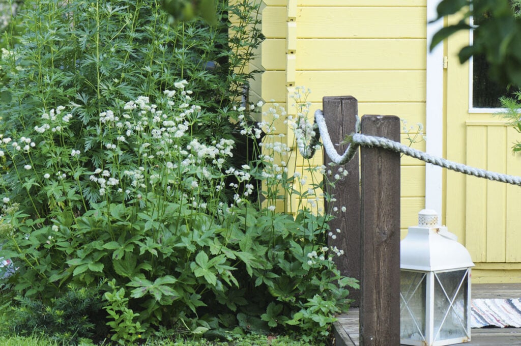Näkymä takapihalla lammen yli. Talon päädyssä olevassa viherhuoneessa voi kasvattaa vaikkapa tomaatteja. Se lämpenee jo varhain keväällä. Kesämajan varjossa kukkivat tähtiputket (Astrantia). Ukonhattujen (Aconitum) nuppuiset kukkavarret kohoavat korkealle.