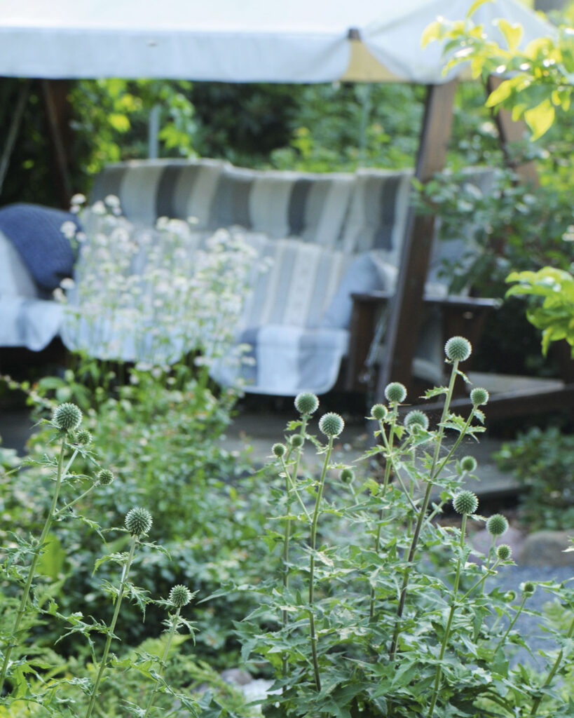 Pallo-ohdakkeita (Echinops) ja siankärsämöäkään (Achillea millefolium) ei pihassa olisi ilman ulkomaisten puutarhakohteiden antia. Ohdakkeen ja kärsämön tapaiset kasvit eivät ole luonnostaan Ullan makuun, mutta hän pitää mielen avoimena uudelle.