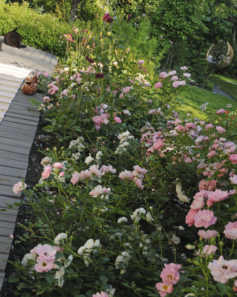 Talon lämpimällä eteläseinustalla on ruusupenkki, jossa valkokukkainen Swany, hempeän vaaleanpunainen Sommerwind ja tummemman pinkki Heidi Klum Rose muodostavat hurmaavan värikimaran. Paikka on niin suojaisa, että Ulla kokeilee, jos saisi magnolian onnistumaan avomaalla. Ruusupenkin reunaksi on suunnitteilla aidanne iisopista (Hyssopus officinalis).