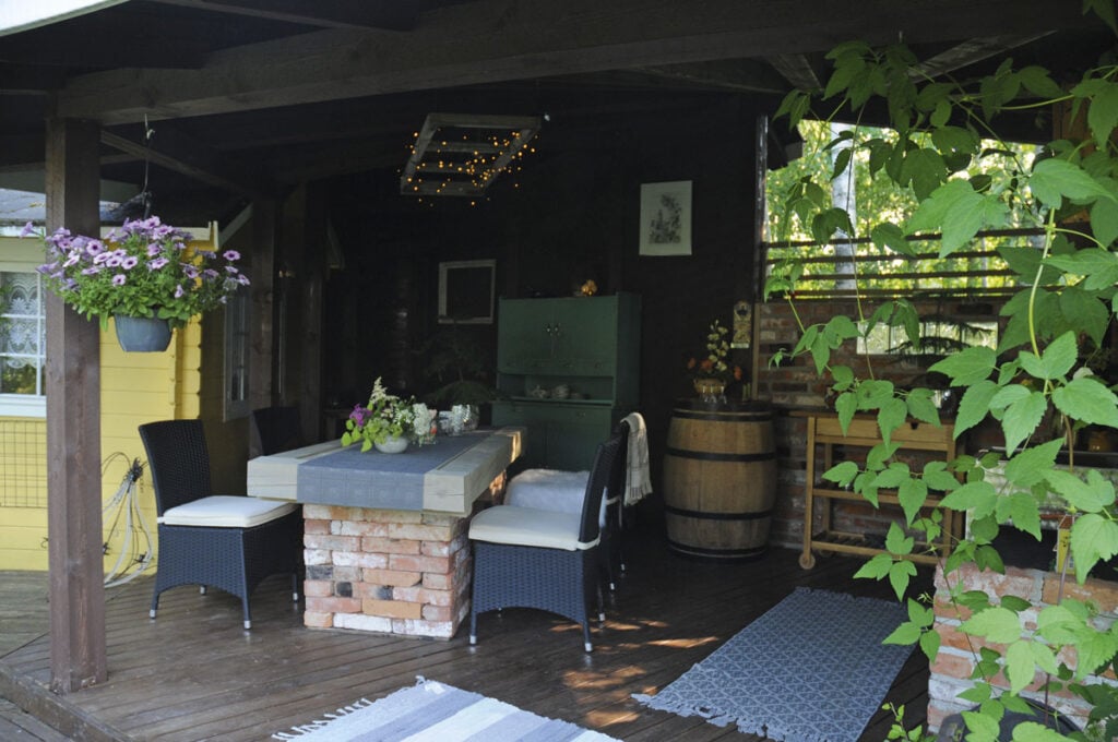 Lopputuloksena on täydellinen pesä, jossa voi istua lähes piilossa. Vanhat tiilet, jollaisista Ulla haaveili, päätyivät tiiliseinäksi sekä pöydänjaloiksi.