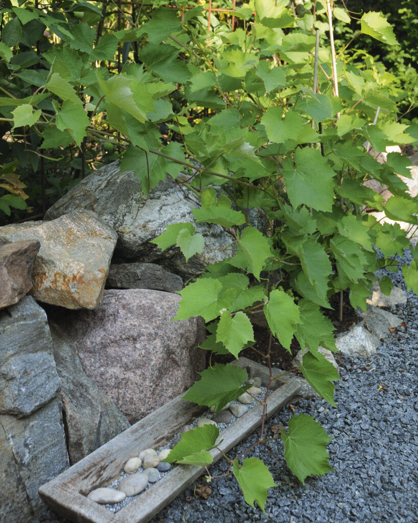 Uuden alueen eteläpäähän tehtiin pieni kivimuuri, jonka juurelle pääsi viiniköynnös 'Somerset Seedless' (Vitis). Kivimuuri tuottaa sille lämpöä, joka auttaa hedelmien kypsymisessä. Ylempänä rinteessä kasvaa talvenkestävämpi 'Zilga', mutta se on tuottanut pienen pettymyksen kivisine rypäleineen.