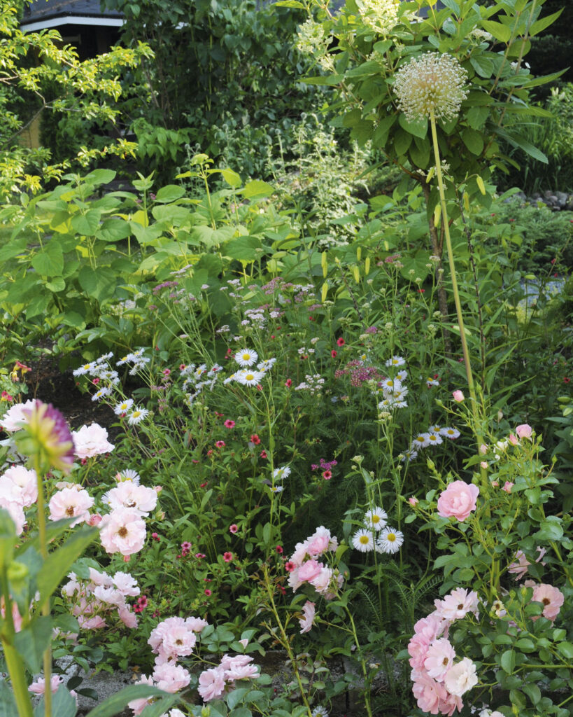 Mininiitty on ulkomaisten puutarhamessujen innoittama. Ruusujen vieressä kukkivat hanhikit (Potentilla), laukat (Allium) ja jalokallioinen (Erigeron Speciosus-Ryhmä), joka on perintökasvi Ullan mummulta.