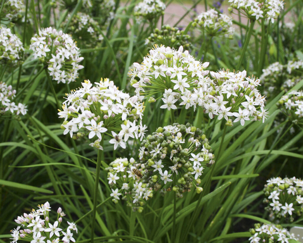 Kiinansipulilla on erityisen kauniit valkoiset, valkosipulilta tuoksuvat kukat.