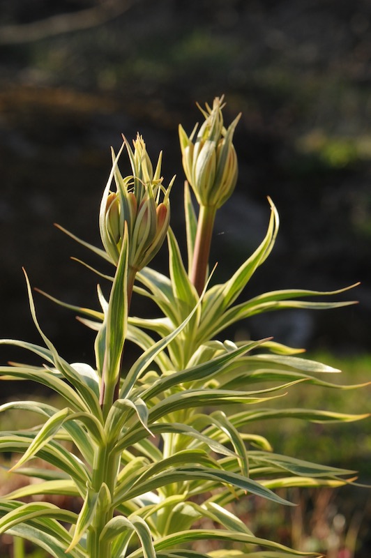 Rehevä pehko ’Luteaa’ demonstroi hyvin, miltä keisarinpikarililjat usein näyttävät. Varsia ja lehtiä, vaan ei kukkia – paitsi että eilen huomasin tuossa yhdessä varressa nuput, keskellä, näetkö? Kukkimisen salaisuus on lannoitus. Ja se on tehtävä nyt, sillä kuukauden päästä keisarin vaatteet, ei kun lehdet, ovat jo kuihtuneet ja ravinto siirtynyt niistä takaisin sipuliin, jolloin juuristokin menee lepotilaan eikä enää ime maasta ravinteita. Juuri nyt, ennen sadetta tai sateella, kun lannoite imeytyy saman tien maahan!