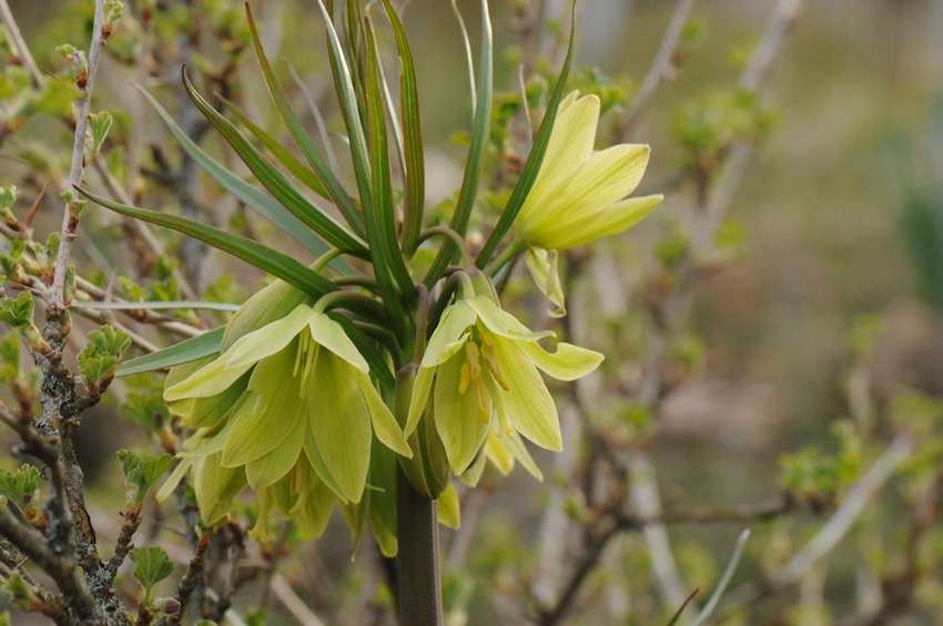 Laitetaan loppuun vielä toinen, tämä kukkii keisareitakin aikaisemmin mutta yhtä komeana. Keisarin serkku Fritillaria raddeana on toistaiseksi vailla suomenkielistä nimeä. Se on jo täydessä kukassa kimalaisten suureksi riemuksi. Väri on ihastuttava kellanvihreä.