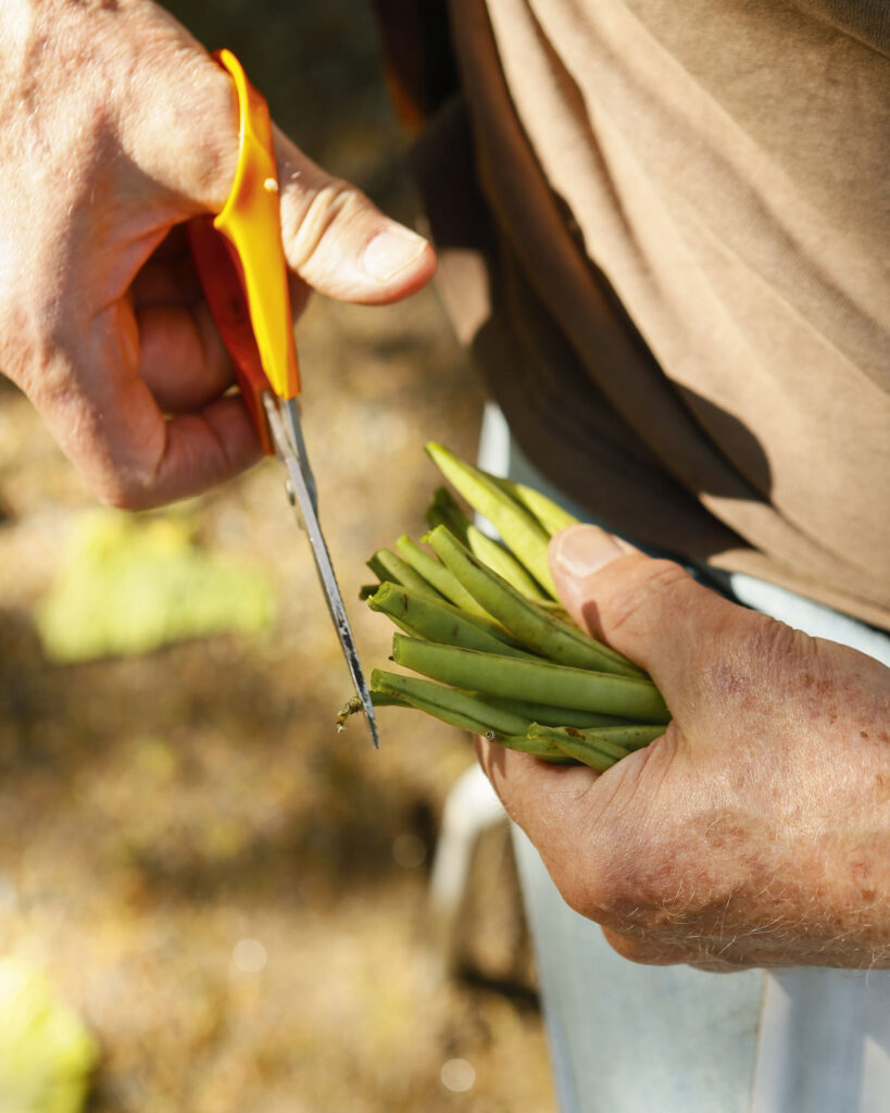 Pakastettavista, vihreistä pavunpaloista leikataan kanta pois. Helpointa on leikata raa'at pavut ennen ryöppäämistä.