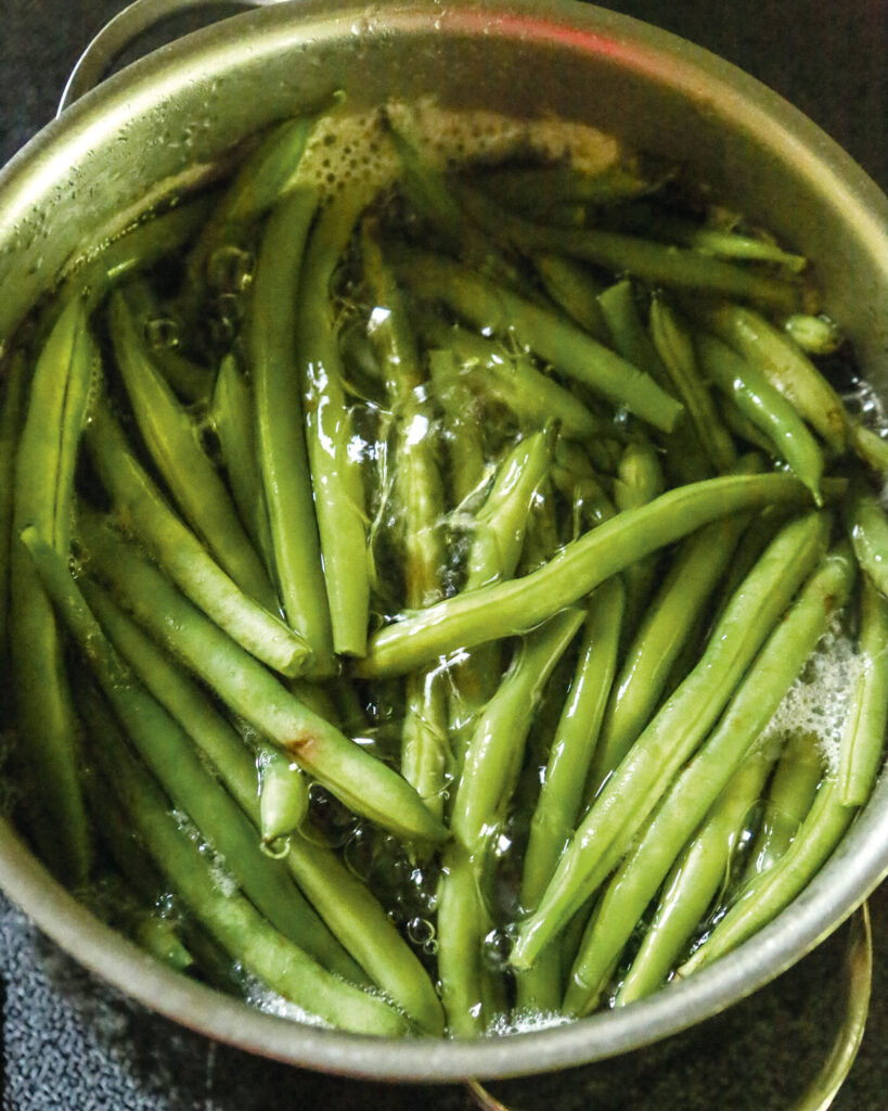 Vihreät pavut ryöpätään eli kiehautetaan vedessä ennen pakastamista.
