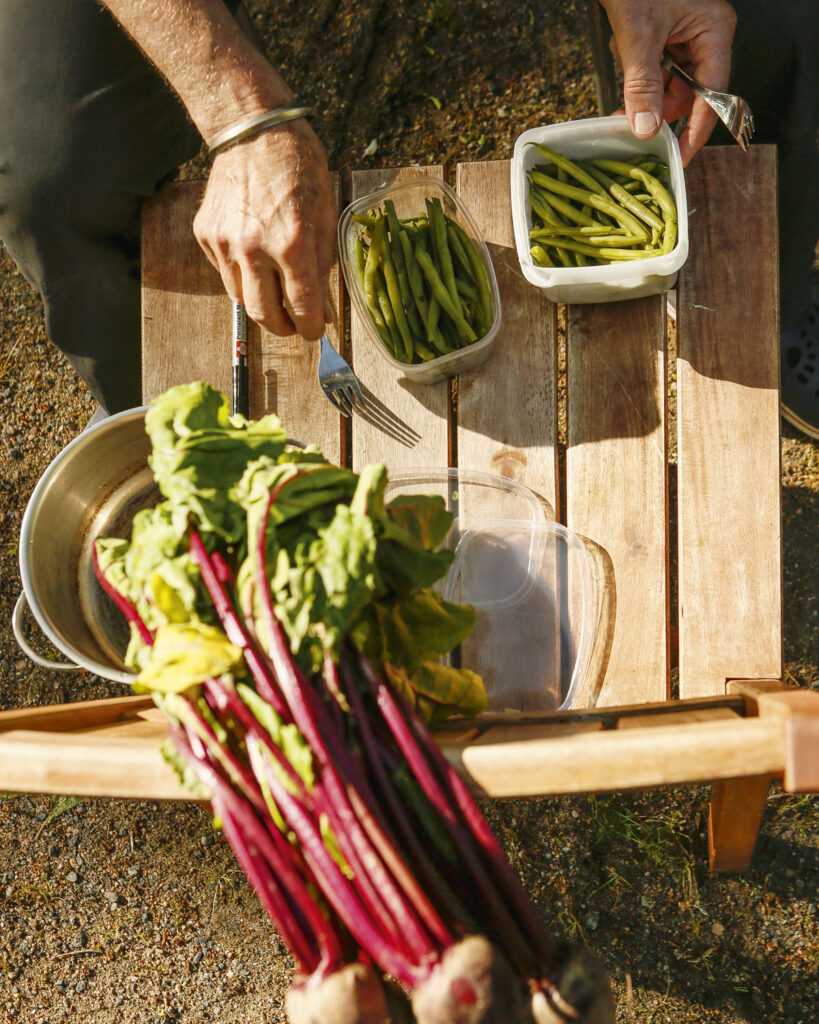 Ryöpätyt palot on pakattu pakastusrasioihin. Edessä on nippu nuoria punajuuria, jotka keitetään, kuoritaan, halkaistaan ja syödään saman tien voinokareen kera.Oikeaoppisesti kuivatut sipulit ovat kauniin kellanruskeakuorisia ja säilyvät ilmavassa paikassa huoneenlämmössä.Versomaan lähteneen valkosipulin versot voi syödä leivän päällä.