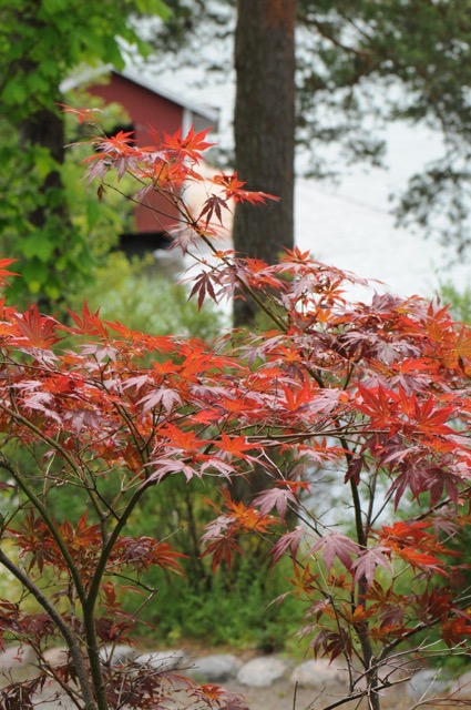 Winqvistien pihalla kasvaa paljon talvenarkoja kokeilulajeja, etenkin erikoisempia puita ja pensaita. Japaninvaahtera on viihtynyt ja talvehtinut avomaalla jo monta vuotta. Kuvassa se toistaa punamullatun venevajan sävyä, alhaalla siintää merenlahti. Meikäläisittäin hyvin nykyaikaisen pensaan ja perinnerakennuksen sekä jylhän luonnonmaiseman liitto on erittäin kiinnostava. Siinä on niin vastakohtaisuutta kuin yhteensointuvuuttakin.