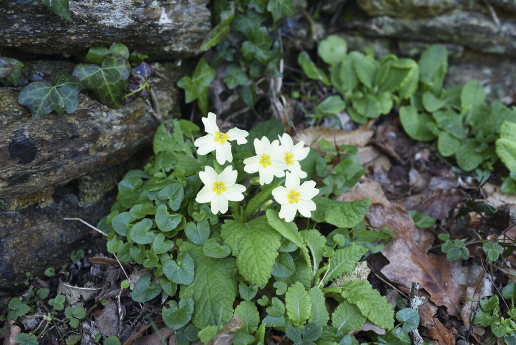 Polku johtaa edelleen peltojen ohi ja nurmelle, joka kimaltelee auringossa valkokukkaisina kaunokaisina (Bellis perennis) ja taivaansinisinä persiantädykkeinä (Veronica persica). Lisää yllätyksiä löytyy, kun polku kaartaa sivujoen uomaa pitkin metsämaisemaan. Villit kääpiöesikot (Primula vulgaris) ovat puhjenneet kukkaan, vaikka paikka ei ole edes aurinkoisin. Siellä ne kuitenkin kurkistelevat maatuvien lehtien ja sammaleisten kivimuurien suojasta.