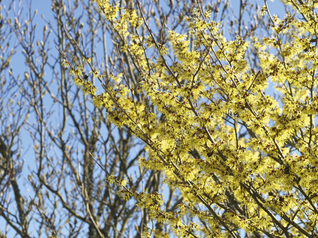 Taikapähkinäpensas kukkii kullankeltaisena varhain helmikuussa.