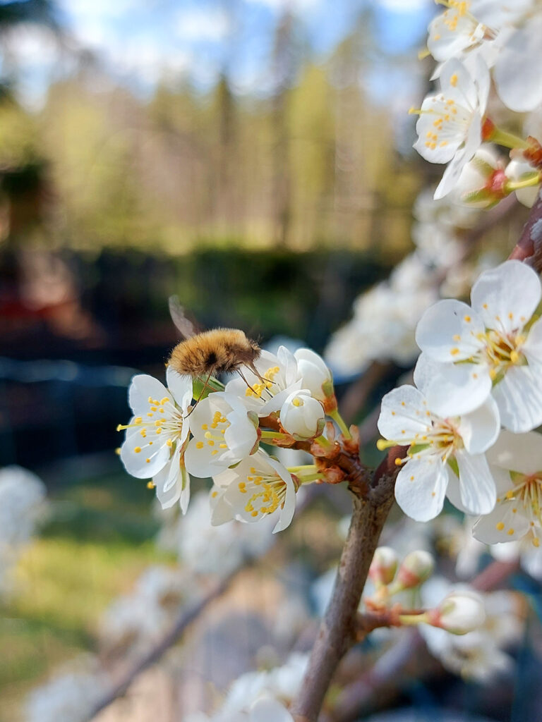 Puuta ihaillessani silmääni osui pari päivää sitten varsin kummallinen ötökkäilmestys. Se lensi paikallaan kolibrin tapaan, se oli karvainen kuin kimalainen, mutta jalat olivat ohuet ja sillä oli pitkä imukärsä, jolla se imi mettä kirsikkaluumun kukista. Nappasin siitä kuvan ja Google Lens-sovelluksen kuvahaulla paljastui, että se on villakärpänen. Ensimmäistä kertaa ikinä törmäsin tähän kimalaiskärpästen heimoon kuuluvaan ötökkään, mikä oli varsin kiehtovaa.