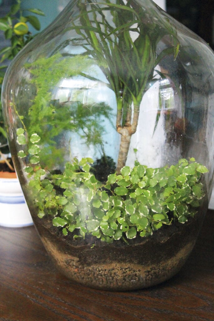 En ole huonekasveihin koskaan suuremmin perehtynyt, mutta valinnat tuntuivat osuneen kohdalleen. Kasvitietoja tovin tutkailtuani sain selville, että niin kääpiököynnösviikuna eli vesifiikus kuin ruokaparsan sukulainen unelma pitävät tasaisesta ilmankosteudesta ja voivat olla haasteellisia kasvatettavia kuivassa huoneilmassa. Pullopuutarhan etu onkin juuri se, että pullon sisällä ilma pysyy kosteana varsin hyvin. On hyvä pitää mielessä, että pulloa ei kannata asettaa liian aurinkoiseen paikkaan. Lämpötila pullon sisällä saattaa muutoin kohota saunamaiseksi.