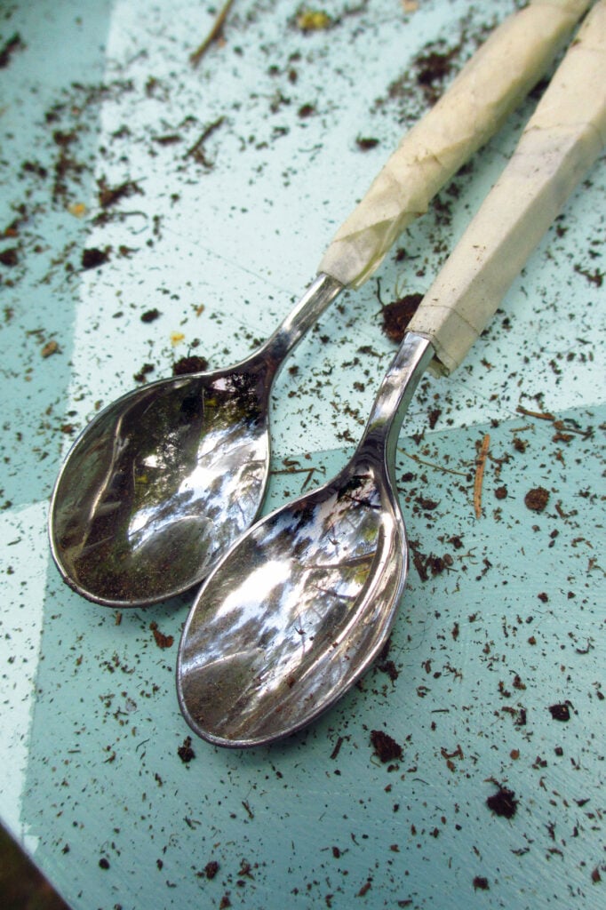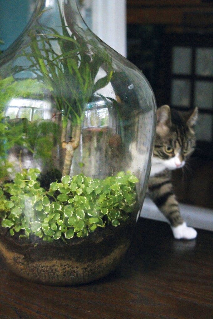 Ohjattuani pullon pohjalle paperitötterön avulla kerrokset lekasoraa, hiekkaa sekä kukkamultaa, hivutin pienet taimet sisälle omatekoisilla työkaluilla, toisin sanoen bambukeppien päihin teipatuilla lusikoilla, jotka saivat toimia pienten kasvien istutuslapioina. Kaiken kruunasi pienikokoinen reunustraakkipuu, jonka sain juuri ja juuri sullottua suuaukosta sisään. Reilun puolen tunnin tarkan lusikkalapioinnin ja muutaman harkitun kirosanan jälkeen pullopuutarha oli valmis ja kieltämättä aherruksen arvoinen. Helpompi vaihtoehto minipuutarhalle voisi toki olla mehitähdet vanhassa kalamaljassa.