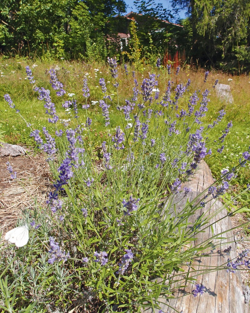 Perhosia lepattaa laventeleilla, jotka ovat talvehtineet paikallaan pitkään.