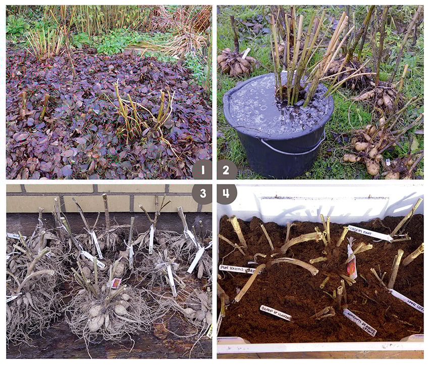 1. Daalioiden varret on leikattu melkein kuukausi sitten paleltumisen jälkeen ja maahan on levitetty lehtiä estämään maan jäätymistä. 2. Marraskuun toisella viikolla sää alkaa kylmetä toden teolla, on aika nostaa juurakot maasta. Juurakoista huuhdotaan enimmät mullat pois. Samalla kiinnitetään nimilaput narulla tai kumilenkeillä. 3. Juurakot saavat kuivahtaa sisällä muutaman päivän ajan, jolloin ne kurtistuvat hieman. Kuiva pinta hillitsee juurakoiden kasvuhaluja varastoinnin aikana. 4. Juurakot pakataan varastolaatikoihin turpeeseen tai kompostikuivikkeeseen. Turve saa olla käytännössä kuivaa, muttei pölyävän kuivaa.