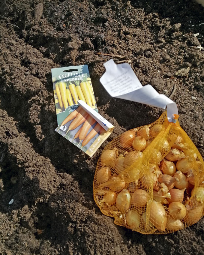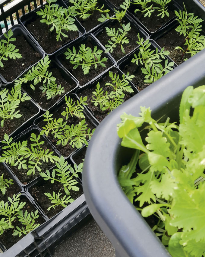 Kumppanuuskasveja lavaan. Porkkanarivien väliin on lavoissa hyvä painella istukassipuleita harhauttamaan porkkanakärpäsiä.