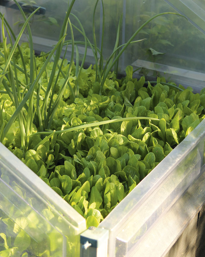 Minikasvihuoneella tai vanhalla ikkunalla katettu lava antaa aikaista salaatti-, retiisi- ja sipulisatoa. Kansi pidättää kosteuden kuivina aikoina ja pitää tuoreravinnon puhtaana siitepölystä ja lintujen jätöksistä.