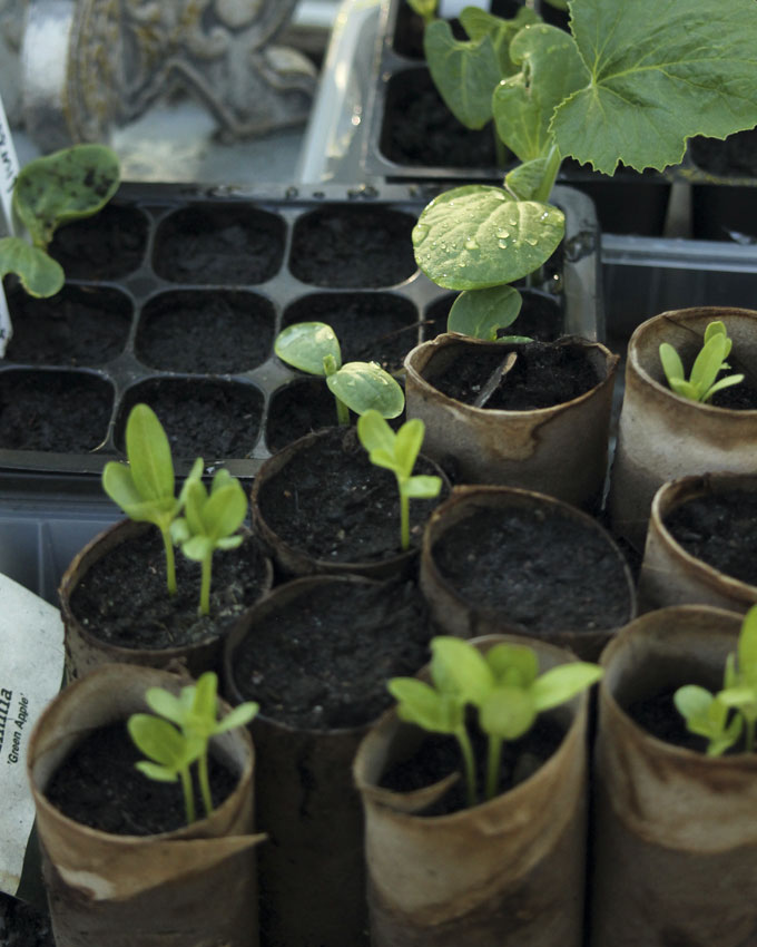Kierrätys kunniaan. Muovikaukalot, vessapaperihylsyt ja maitopurkit toimivat taimikasvatuksessa.