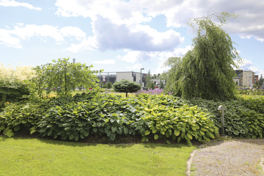 – Kuunliljat on istutettu kuusi vuotta sitten tiheään, ja niitä voi jakaa kirveellä. Istutan kasveja tiheään, jotta kosteus pysyy eikä rikkaruohoille jää kasvutilaa. Pahin rikkaruoho on peltokorte, kuvailee Sol-Britt.