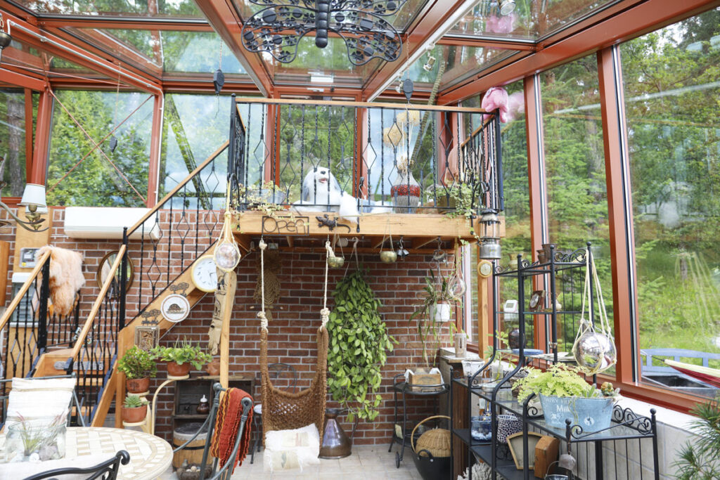 Sol-Britt oli suunnitellut talvipuutarhan jykeväksi, ja rakennusmestarina toimiva puoliso rakensi sen. Siellä voidaan ottaa vieraitakin vastaan.