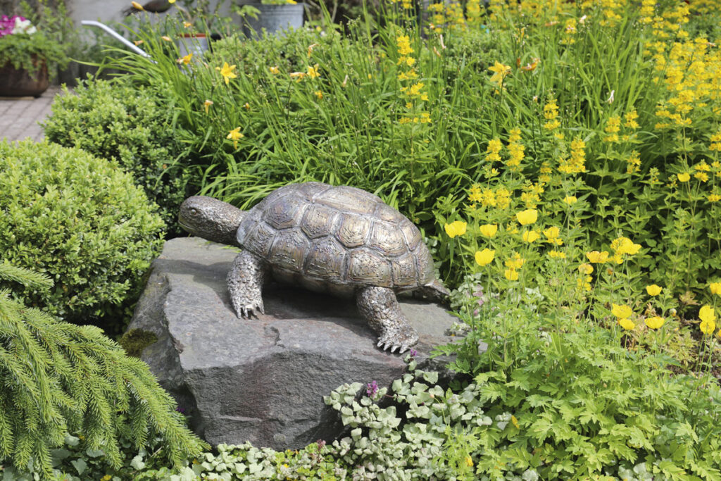 On Sol-Brittillä rauhallisempiakin eläimiä, sillä hänellä on kodissa kolme kilpikonnaa. Puutarhan kasvien lomasta pilkistävät kuitenkin betoniset ja metalliset kilpikonnat.
