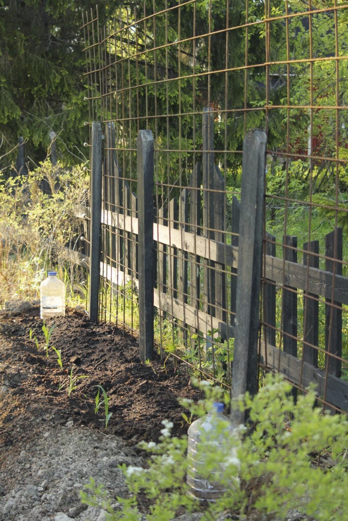 Kun pihalta loppuu ala kesken, on aika laajentaa ylöspäin! Metallisiin tolpanjalkoihin upotetut ja ruuvatut puutolpat ovat kestävät. Niiden väliin kiinnitetään tukevaa verkkoa, esimerkiksi suuret palat raudoitusverkkoa. Painava verkko on kätevä kiinnittää tolppaan ruuveilla ja pienillä pätkillä metallista reikänauhaa.